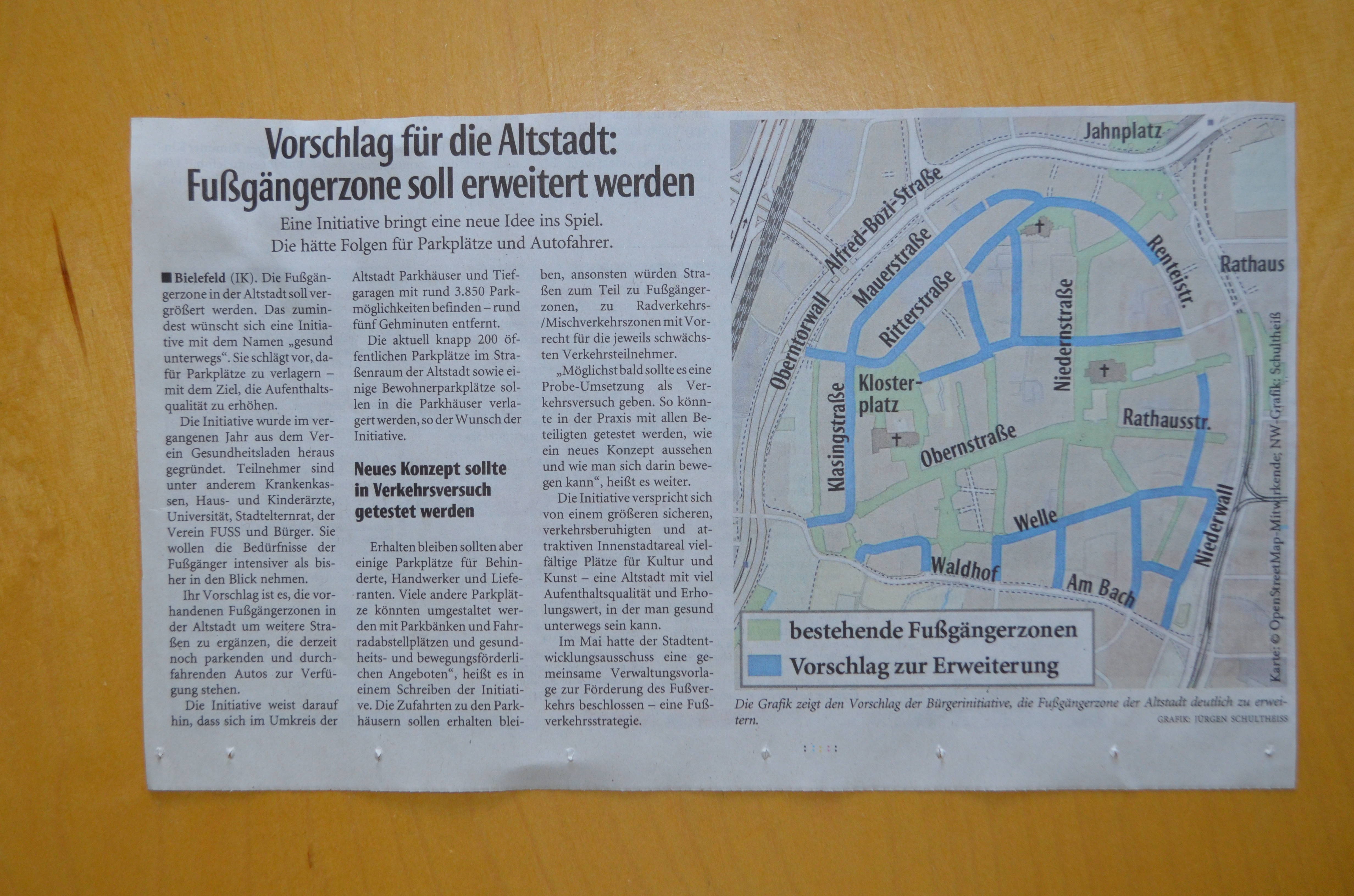 Die NW und das WB berichteten am 13.07.2020 über die Vorschläge der Initiative "gesund unterwegs" zur Weiterentwicklung der Altstadt durch Erweiterung der Fußgängerzone und Verlagerung der Parkplätze in die Parkhäuser und Tiefgaragen. Dazu wurden ein Konzept und ein Plan der Altstadt erstellt. Die aktuelle Diskussion zur Sicherheit der Altstadt und zum Einsatz von sog. "modalen Filtern" zur temporären Sperrung haben wir in unsere Skizze der Altstadt aufgenommen. Die AG ist mittlerweile auch in dem Projekt "altstadt.raum" vertreten, in dem es um die partizipative Weiterentwicklung der Altstadt zur Erhöhung der Lebens- und Aufenthaltsqualität geht. Am 4.8.2021 haben wir einen Rundgang in der Altstadt gemacht und die Erfahrungen und Wahrnehmungen in einem kurzen Protokoll zusammengestellt. Am 1.9.2021 haben wir uns die Strecke von Sieker-Endstation bis Stieghorst-Endstation vorgenommen, um auch die Fußläufigkeit in den Stadtbezirken zu testen. Informationen dazu in einem kurzen Protokoll und einem Bericht in der NW.
